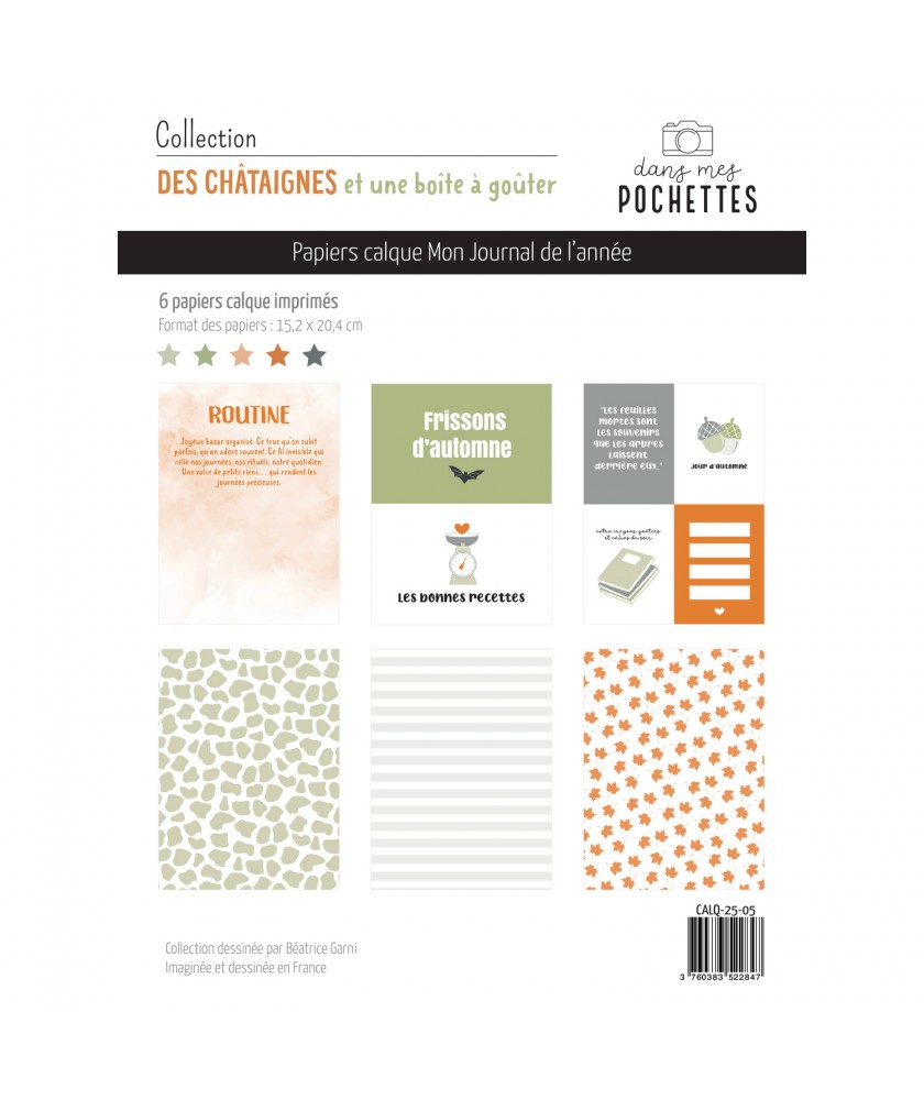 ASSORTIMENT DE 6 PAPIERS CALQUE 15 CM X 20 CM DE LA COLLECTION DES CHATAIGNES ET UNE BOITE A GOUTER
