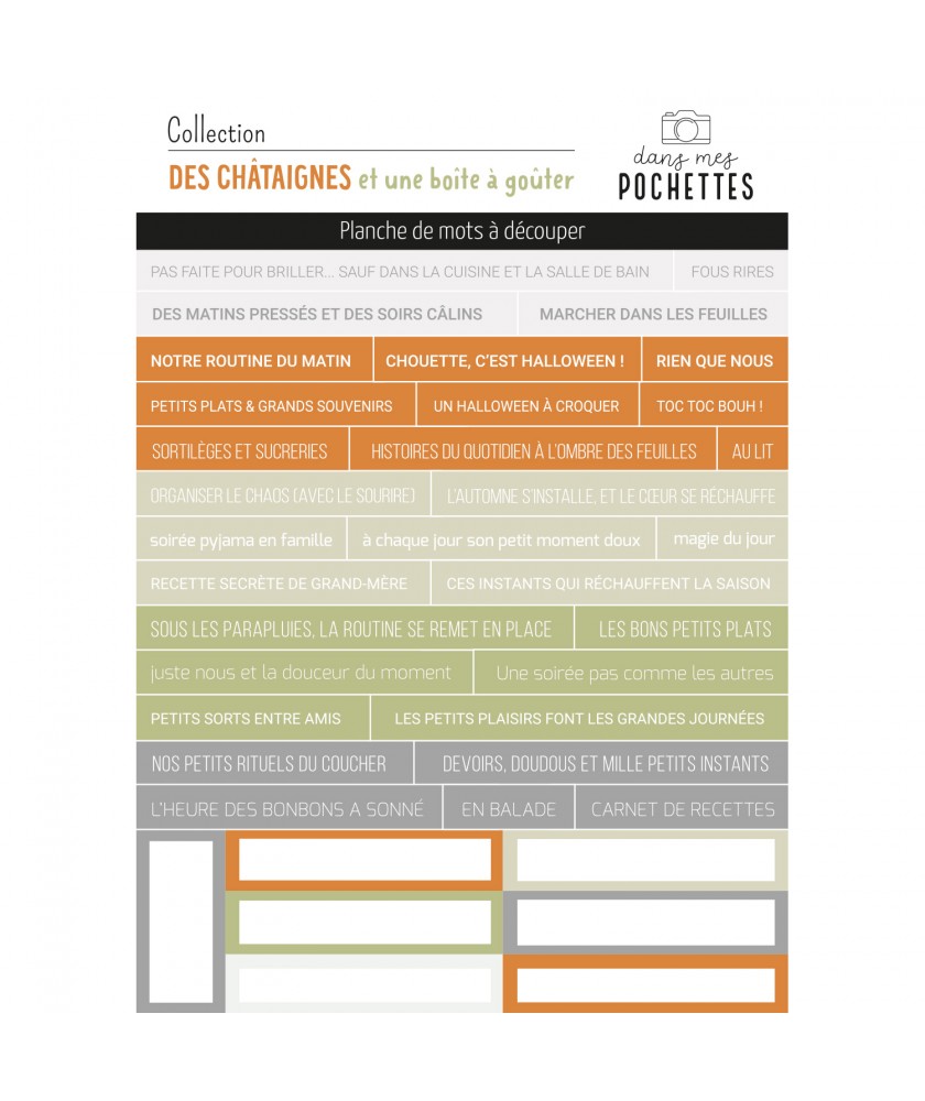 Planche de MOTS A DECOUPER de la collection DES CHATAIGNES ET UNE BOITE A GOUTER