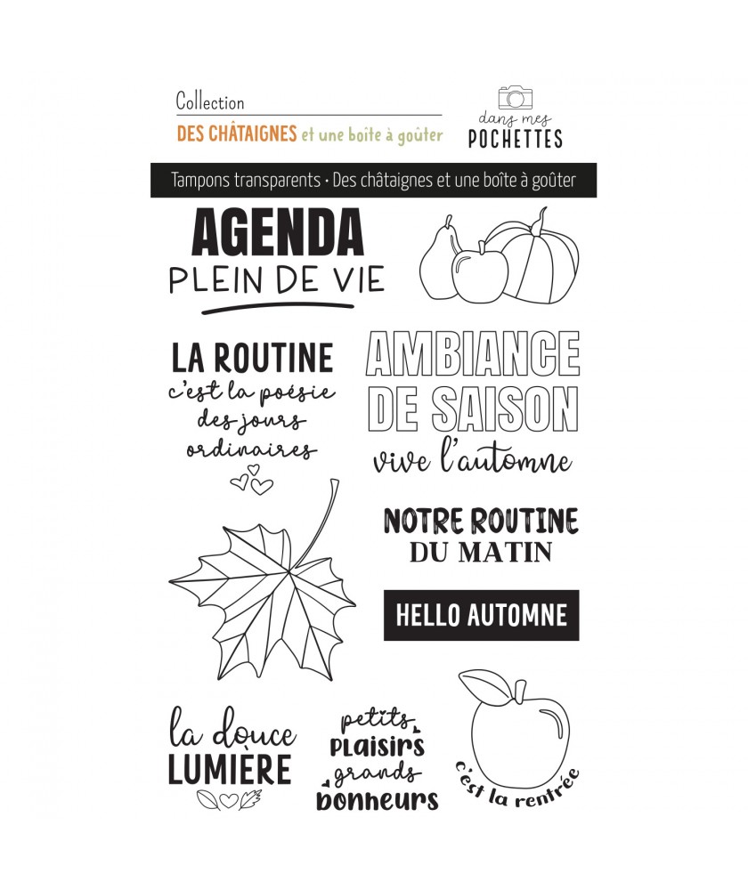 PLANCHE DE 10 TAMPONS CLEAR COLLECTION DES CHATAIGNES ET UNE BOITE A GOUTER