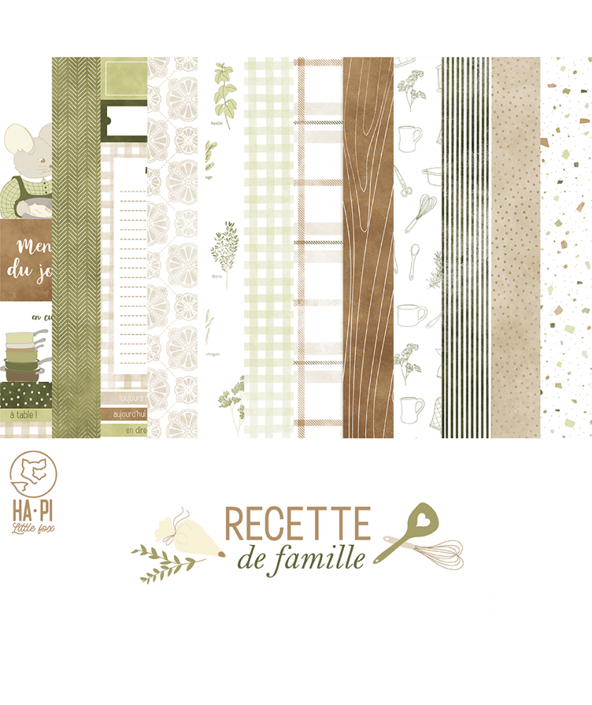 kit de 6 papiers imprimés recto verso + 3 papiers unis duo recto verso , collection Recette de famille de la marque HA.PI little fox