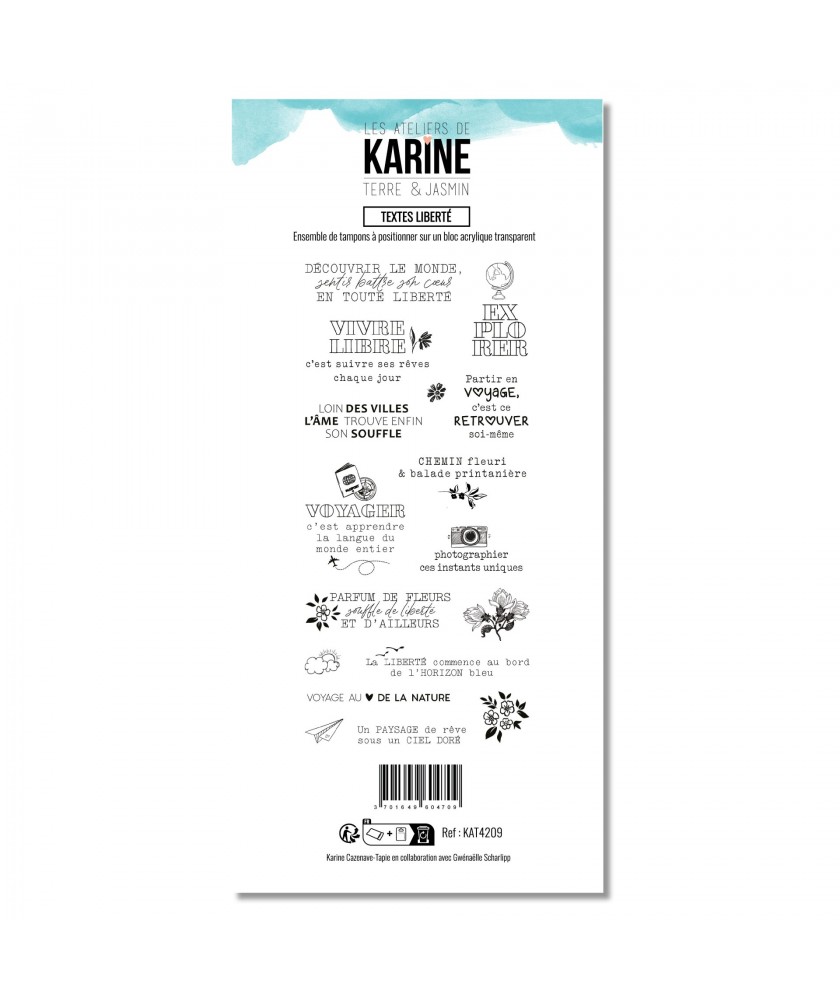 Planche de 17 tampons clear définitions collections Terre & Jasmin de la marque Les Ateliers de Karine