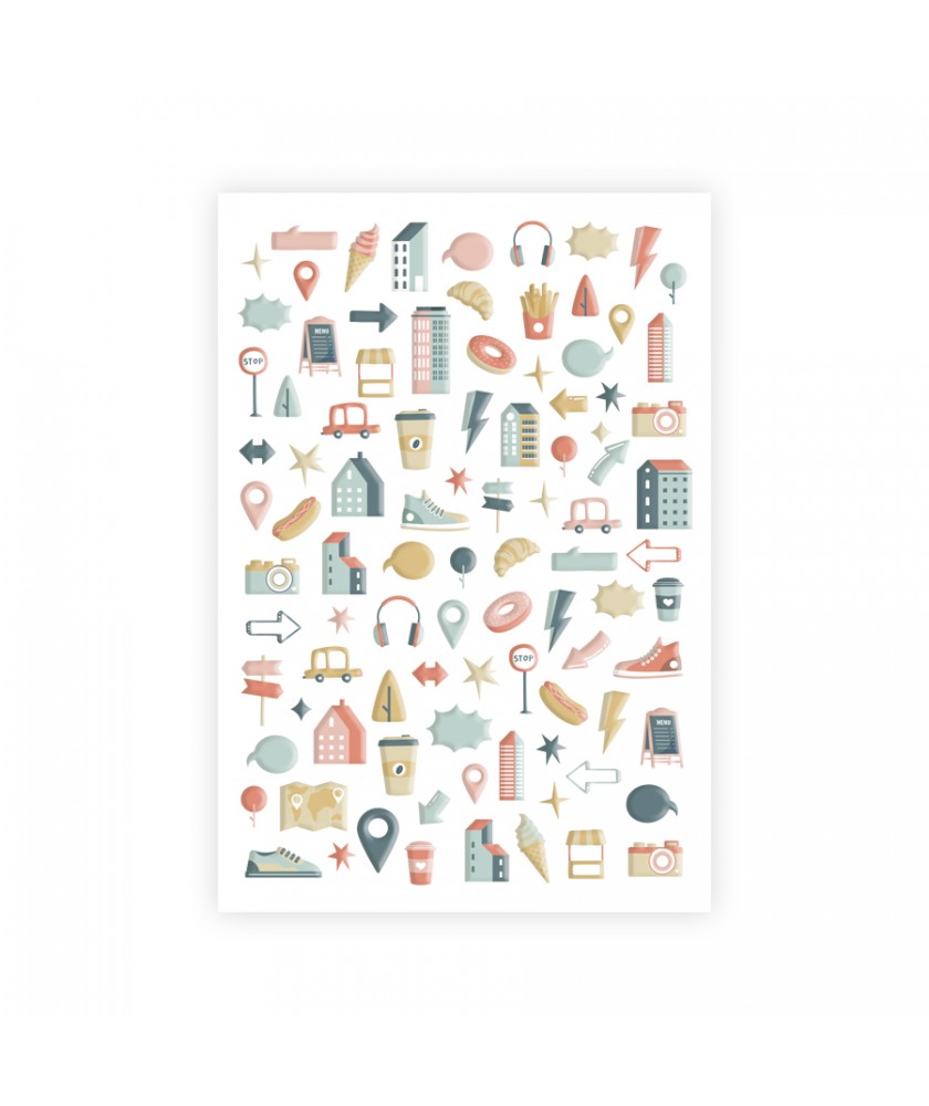 Planche de 94 puffy stickers collection URBAN STORIES de la marque Les Ateliers de Karine