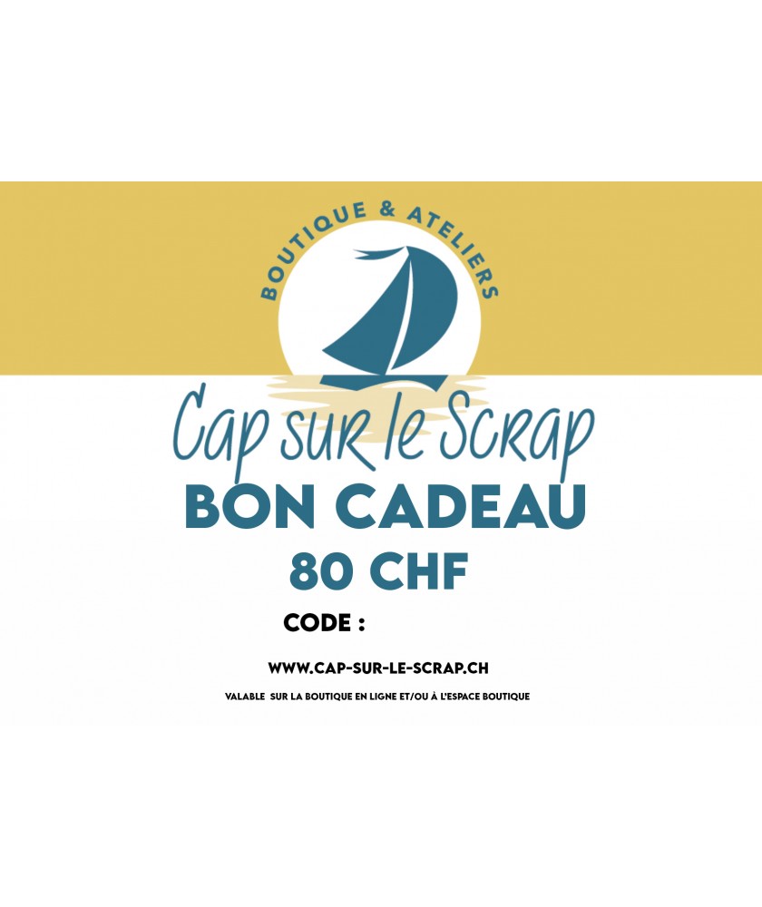 Bon cadeau 80 CHF. Le bon est envoyé par mail avec le code de réduction. Si vous commandez uniquement un bon, veuillez cocher la case RETRAIT EN MAGASIN pour éviter des frais d'envoi supplémentaires